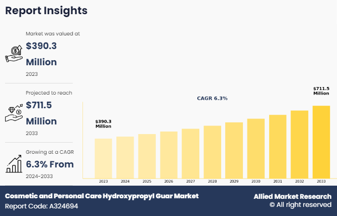 WILMINGTON, DE, UNITED STATES, November 27, 2025 /EINPresswire.com/ -- Allied Market Research published a report, titled, "Cosmetic and Personal Care Hydroxypropyl Guar Market by Application (Skin Care, Hair Care, Makeup, Hygiene Products, and Others): Global Opportunity Analysis and Industry Forecast, 2024-2033". According to the report, the cosmetic and personal care hydroxypropyl guar market was valued at $390.3 million in 2023 and is estimated to reach $711.5 million by 2033, growing at a CAGR of 6.3% from 2024 to 2033.Download Sample Pages of Research Overview: https://www.alliedmarketresearch.com/request-sample/A324694